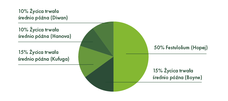 FARMCOVER DRY zawiera 50% festulolium trzeciej generacji, które – wraz z tetraploidalnymi odmianami traw – stawia czoła niesprzyjającym warunkom i zapewnia trwałą, odporną darń. Odmiana „Boyne” jest znana ze swojej wyjątkowo wysokiej wydajności w pierwszym pokosie i gwarantuje stabilność plonowania.